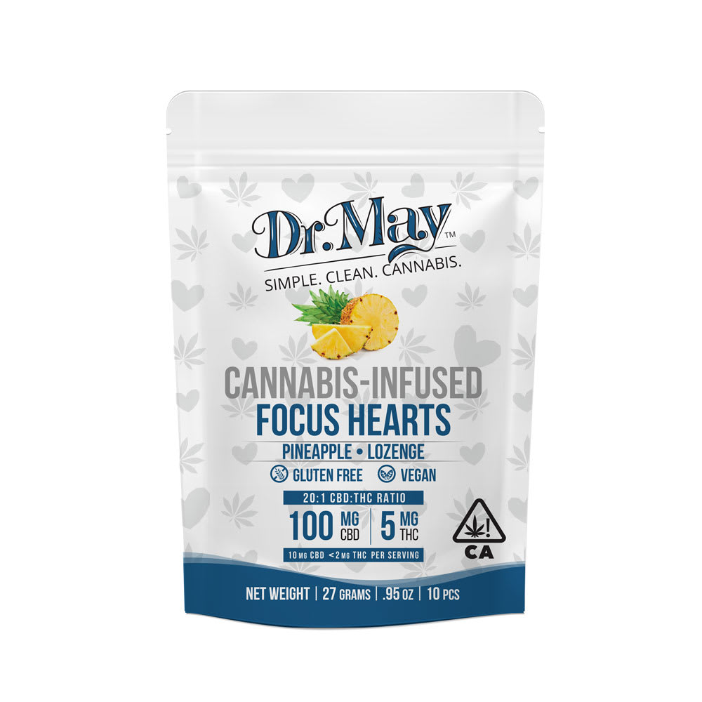 Focus Hearts are a pineapple lozenge formulated in a high CBD ratio, creating a mild, calming sensation. Naturally flavored with fruit based flavorings, each heart contains 10mg CBD and 1/2mg THC. There are 10 Hearts in a package. Expect to feel the effects in 15-30 minutes.